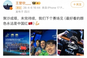 赛后王楚钦更新社媒,晒出国乒合影以及领奖台上和松岛辉空、雨果、林昀儒的自拍合影,并配文写道:“聚沙成塔,未完待续,我们下个赛场见(最好看的颜色永远是中国红🇨🇳)!”