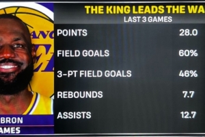 在最近的三场比赛中,詹姆斯场均28分7.7篮板12.7助攻,投篮命中率60%,三分命中率46.2%。