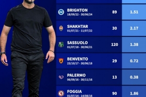 德泽尔比执教生涯场均积分:矿工2.17分最高,巴勒莫0.38分最低