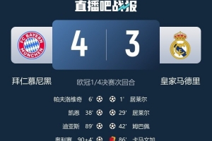 体育资讯4月16日讯 欧冠1/4决赛次回合,拜仁主场4-3逆转击败皇马,并以6-4的总比分晋级四强。