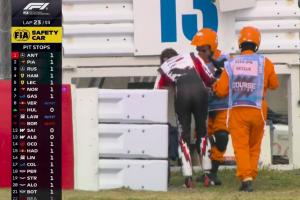 体育资讯03月29日讯 F1日本站正赛,第22圈,贝尔曼撞车退赛,下车后一瘸一拐。